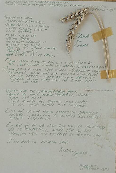 In 1973 zijn we getrouwd. Eerst met een feest in Warmenhuizen, met onze vrienden van Wammes. Tijdens dat feest is een stel snel vertrokken, omdat de eerste weeën begonnen. Dochter Masja woont nu vlak bij ons in Schagen.