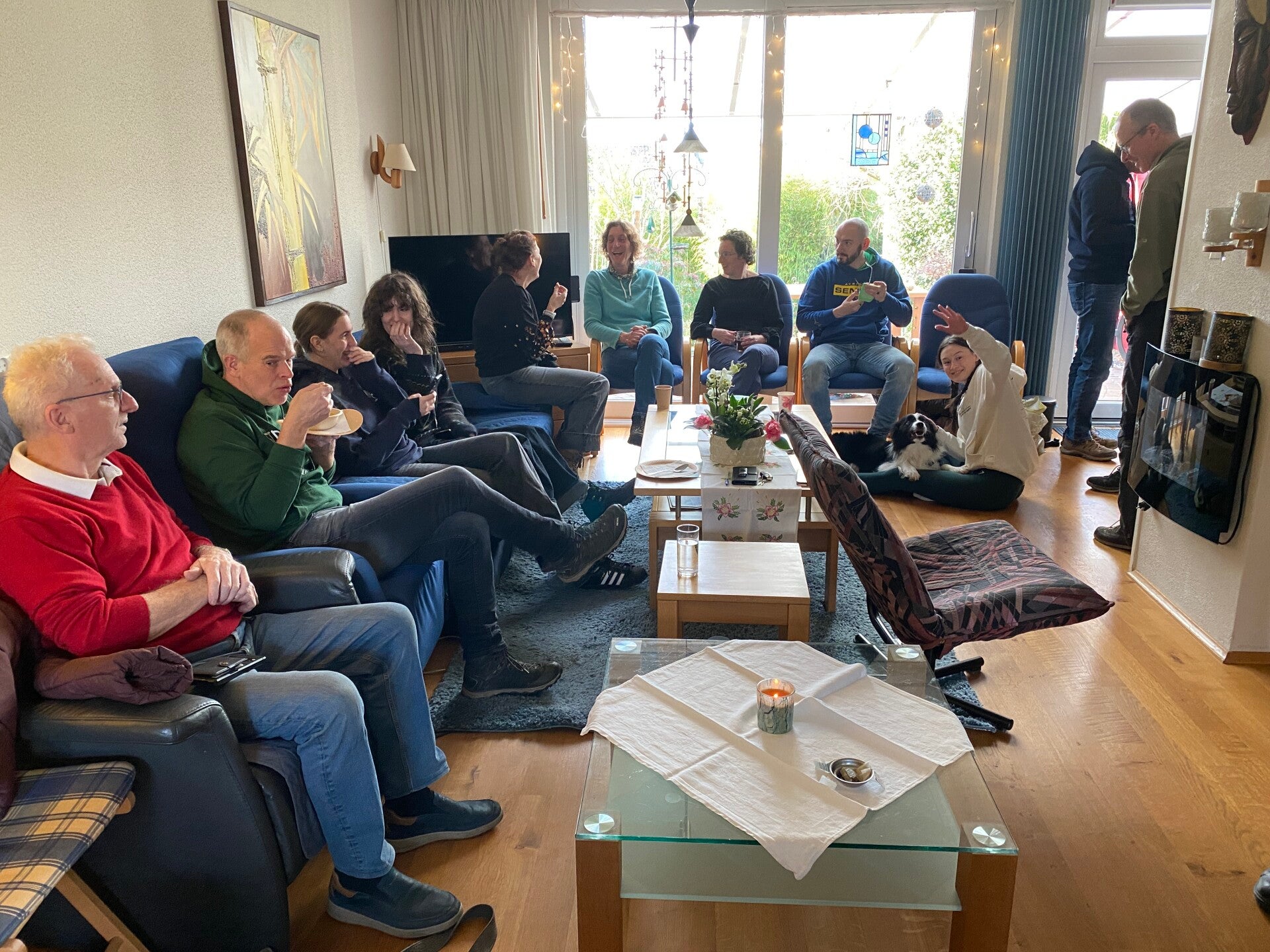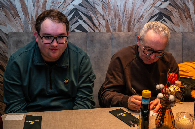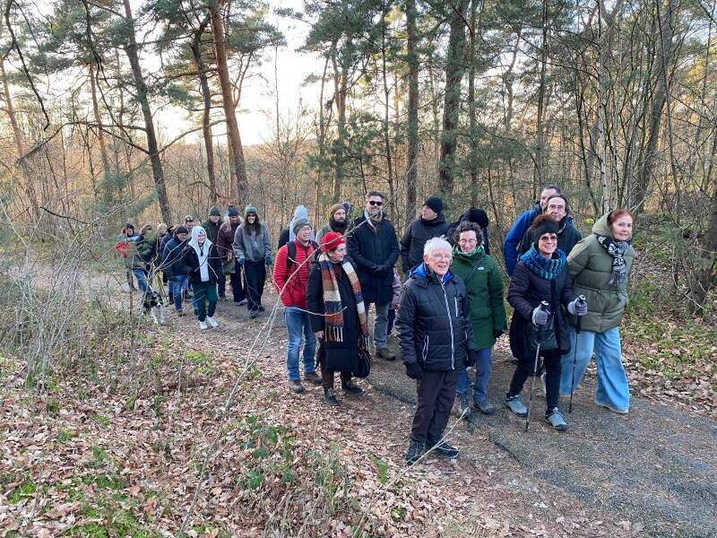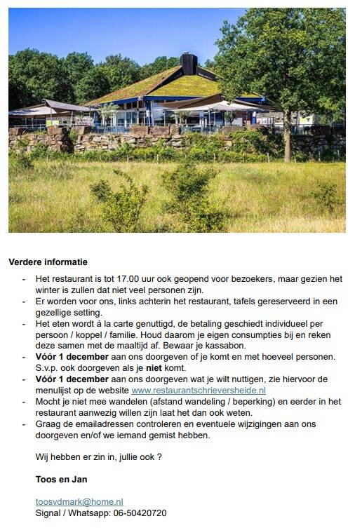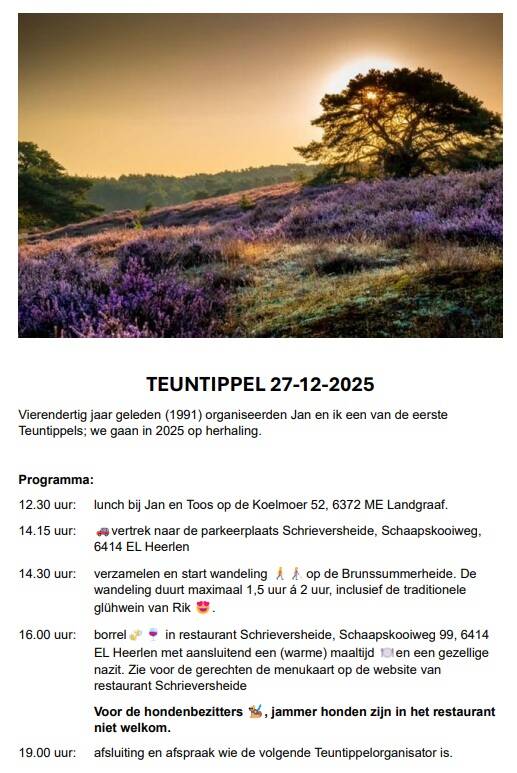 Helaas moesten Wiel en Nadine afzeggen. Beterschap gewenst! We werden goed ontvangen op de Koelmoer. De hulptroepen van Toos konden na het smeren van de broodjes nog net bijkomen, voordat het huis volliep. Bij de Schrieversheide splitste het gezelschap. Een deel voor de prachtige wandeling op - voor velen van de familie van der Mark - nostalgisch terrein. De anderen voor spelletjes canasta of bijbabbelen. Jan had de route voorgelopen en Simone had er een deel van hardgelopen tijdens de kerstcross. Halverwege deelde Rik natuurlijk weer glühwein uit. Samen met de ondergaande zon kwamen we weer bij het restaurant, waar we genoten van de Teuntippeltraditie. Volgend jaar zet Peter die voort.